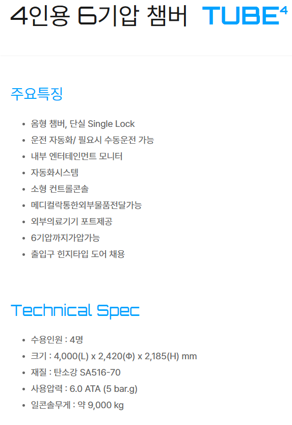 수용인원 : 4명 / 크기 :4,000(L) x 2,420(Φ) x 2,185(H) mm / 재질 : 탄소강 SA516-70 / 사용압력 : 6.0 ATA (5 bar.g) / 일콘솔무게 : 약 9,000 kg