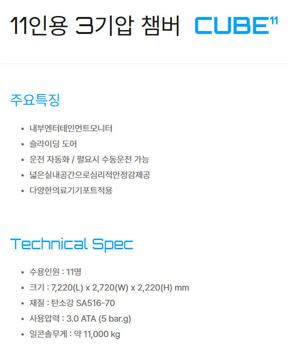 수용인원 : 11명 / 크기 :7,220(L) x 2,720(W) x 2,220(H) mm / 재질 : 탄소강 SA516-70 / 사용압력 : 3.0 ATA (5 bar.g) / 일콘솔무게 : 약 11,000 kg